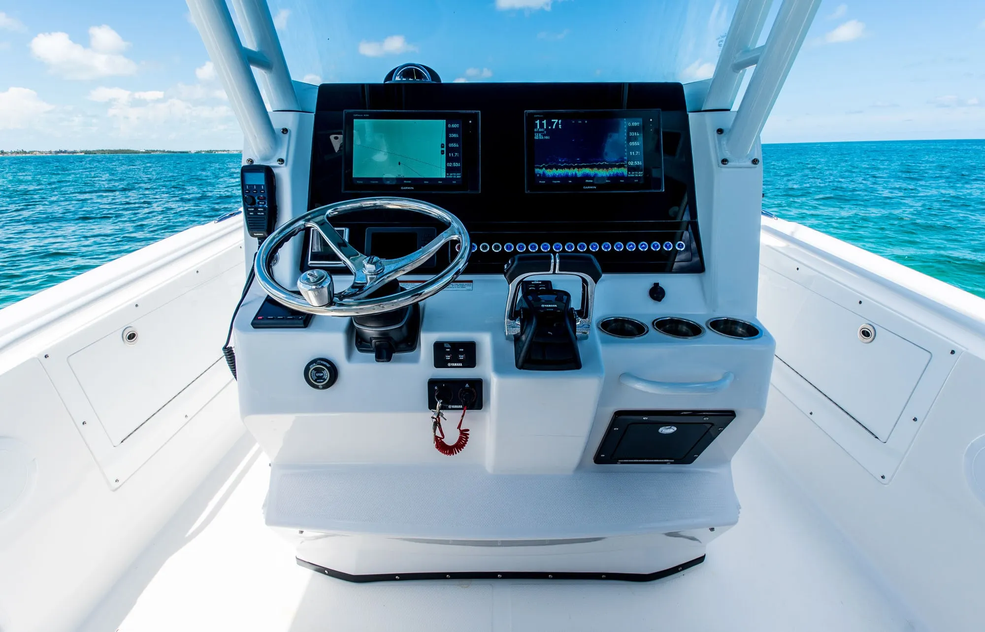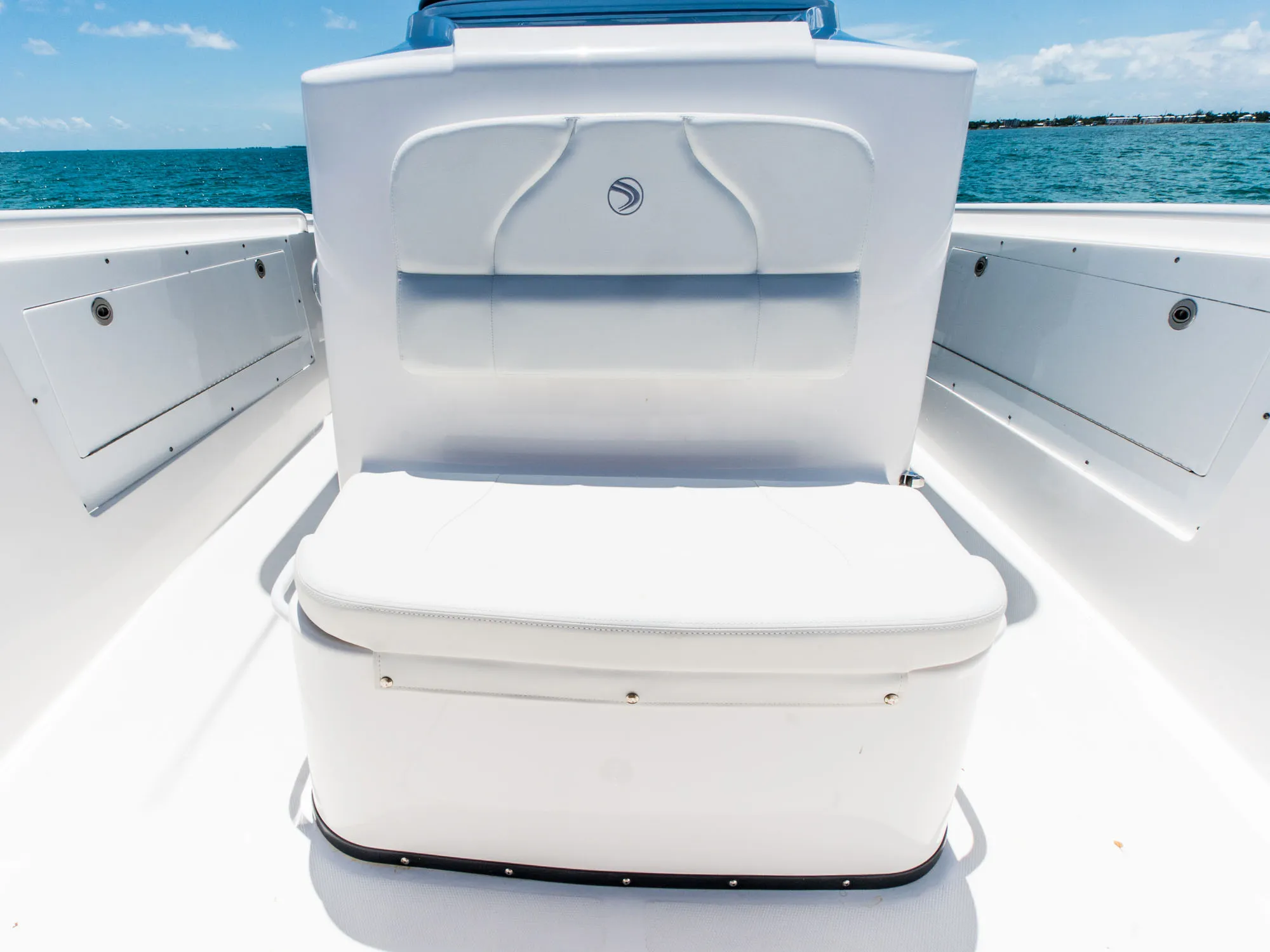 • Fiberglass Cooler Leaning Post w/ Removable 48QT Cooler, SS Fresh Water Sink, Pull-out Shower, Cutting Board, Storage Drawers, Aluminum Rod Holders (4), Grab Handle, Drink Holders (2) & Adjustable Flip-Bolster Helm Seats