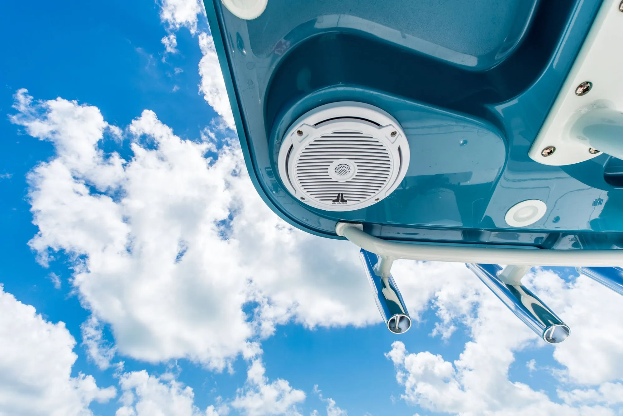 • Fiberglass Hardtop w/Rod Holders (6), LED Spreader Lights (2), Helm Light, Instrument Box, & Skylight